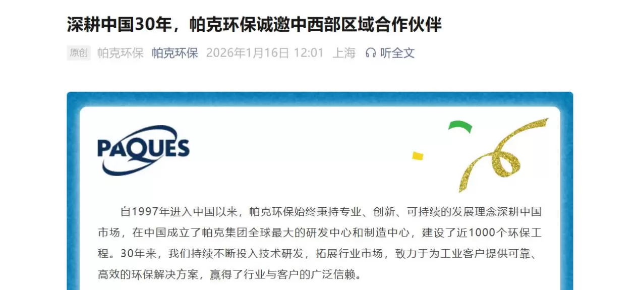 今年1月,帕克环保技术(上海)有限公司(下称“帕克环保”)通过公众号推文正式发出邀请,希望能和中西部合作伙伴一起共同深耕中国市场,为我们的绿水青山贡献更多环保价值。