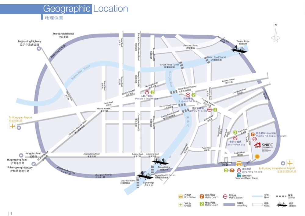 上海新国际博览中心战略性地坐落于浦东经济开发区,距离上海新国际博览中心 600 米处有一大型交通枢纽站,即龙阳路站(位于龙阳路上),包括多条公交线路起点站、轨道交通 2 号线龙阳路站、轨道交通 7 号线龙阳路站以及磁悬浮列车终点站。从 2 号线龙阳路站步行到展馆大约需 10 分钟;从 7 号线花木路站步行到展馆大约 1 分钟。