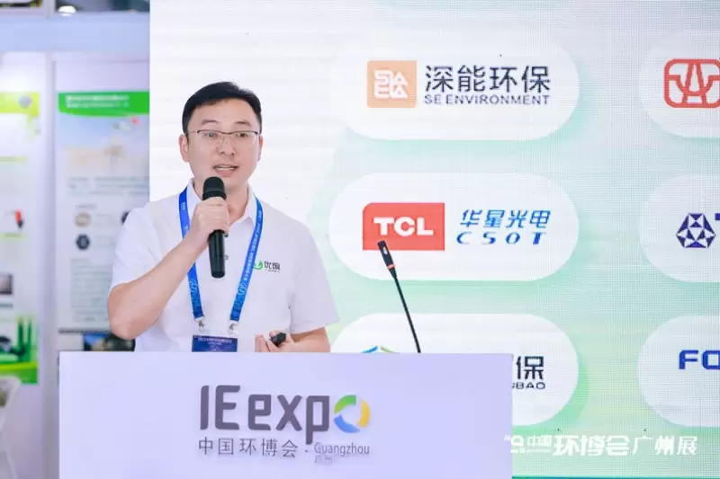 ▼优废环保副总经理杨凯在环博会广州展“一刻讲台”上演讲