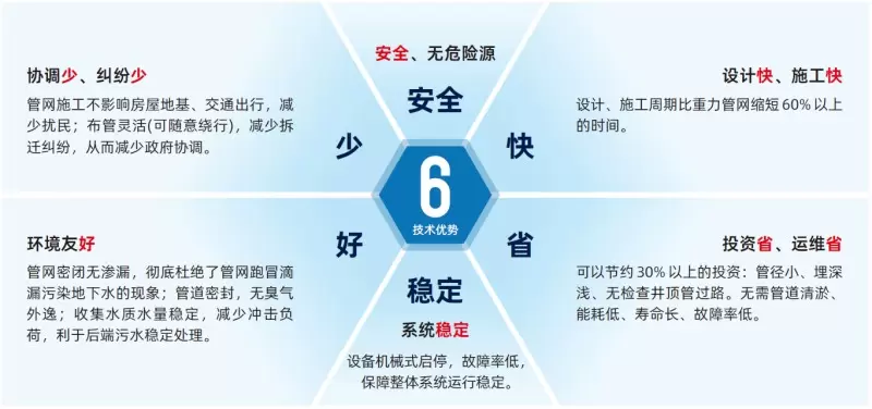 而在高速服务区,负压系统管径细(主管DN80-DN100)、埋深浅(0.6-1米)可通过顶管、定向钻等非开挖技术穿越高速,不影响交通;且全程密封,杜绝污水渗漏污染,避免雨水渗入增加处理负荷。