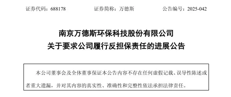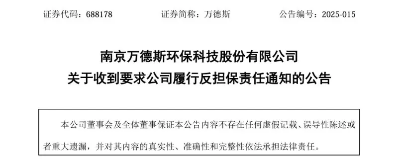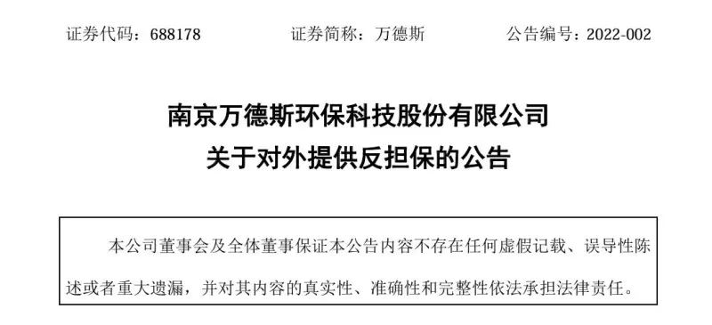 10月21日,南京万德斯环保科技股份有限公司(下称“万德斯”)发布公告称,因参股公司万德斯(唐山曹妃甸)环保科技有限公司(下称“曹妃甸万德斯”)贷款违约,公司被东江环保股份有限公司(下称“东江环保”)诉至法院。