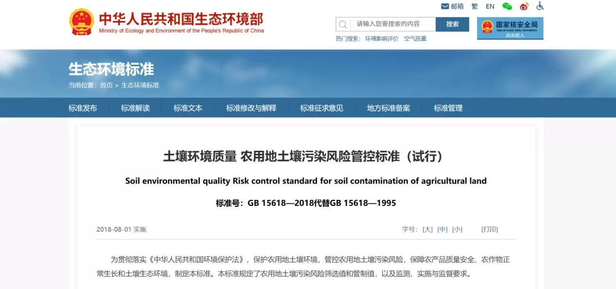 ▼《土壤环境质量农用地土壤污染风险管控标准(试行)》(GB 15618-2018)。图片来源:生态环境部
