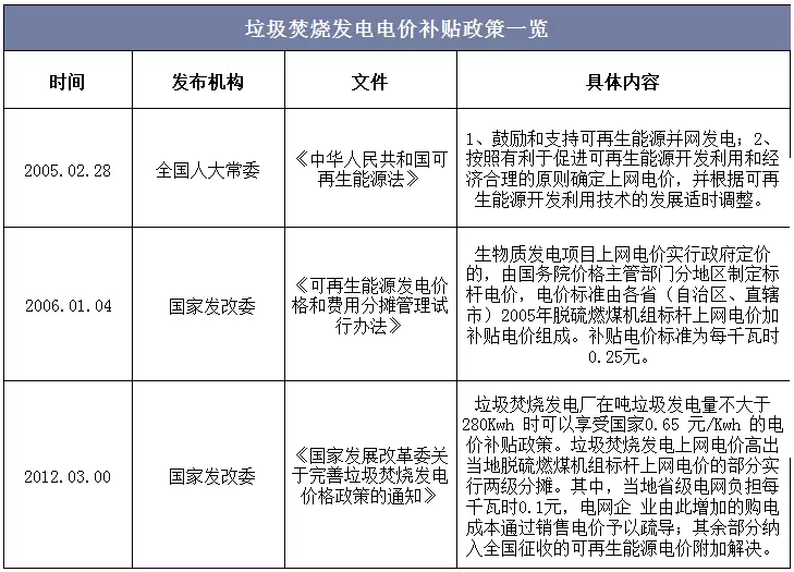 ▼垃圾焚烧发电电价补贴政策一览。图片来源:北极星火力发电网