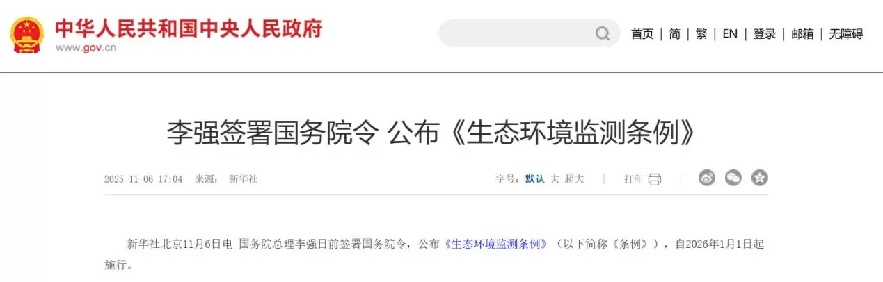 11月6日,据新华社报道,国务院总理李强日前签署国务院令,公布《生态环境监测条例》(下称《条例》),自2026年1月1日起施行。