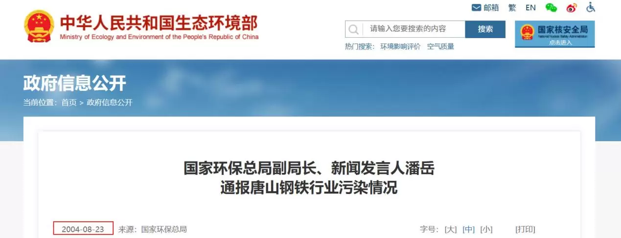 早在2004年,时任国家环保总局副局长、新闻发言人潘岳就通报过唐山钢铁行业污染的有关情况。他指出,造成唐山钢铁行业污染严重的主要原因是一些地方领导仍以牺牲环境为代价、片面追求经济增长,必须坚决纠正这种错误的发展观和政绩观,促进区域经济社会的可持续发展。