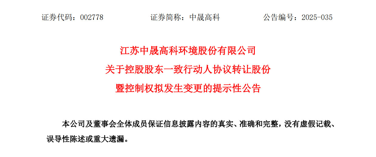本次交易完成后,中晟高科控股股东将由吴中金控变更为福州千景,实际控制人则由苏州市吴中区人民政府变更为翁声锦与何从。