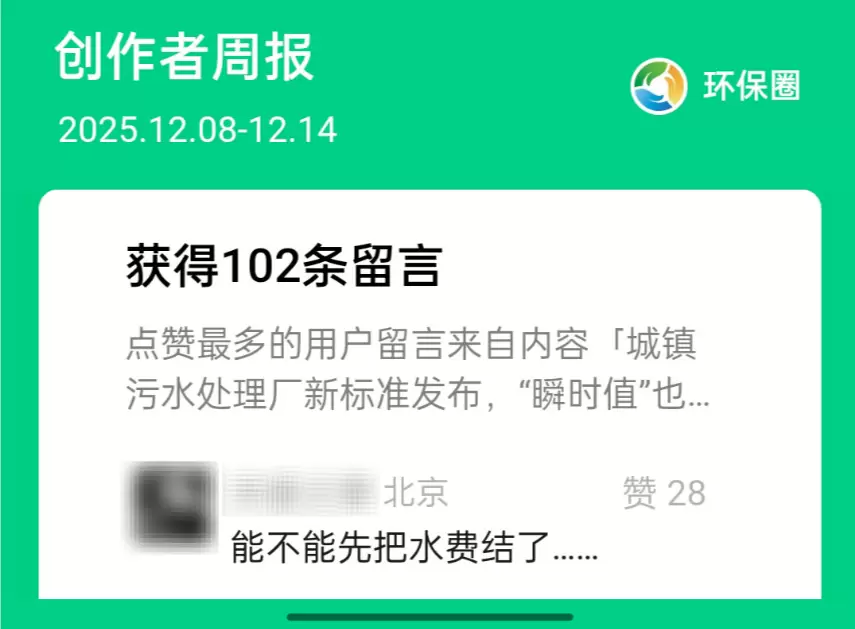 过去的一个礼拜,“环保圈”公众号获得了102条留言,其中点赞最多的留言来自文章《城镇污水处理厂新标准发布,“瞬时值”也能作为执法依据了》。