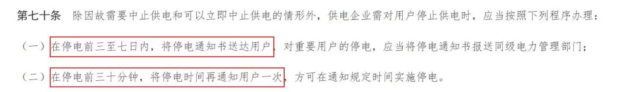 ▼《供电营业规则》第七十条规定。图片来源:发展改革委网站