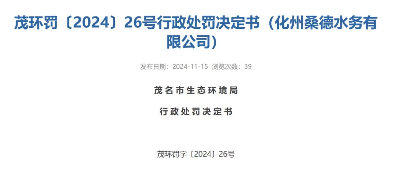 2024年11月,同样是在广东(这里的财政支付能力相对还算好的),化州桑德水务有限公司(下称“化州桑德”)就因为超标排放,被茂名市生态环境局罚款61.5万元。