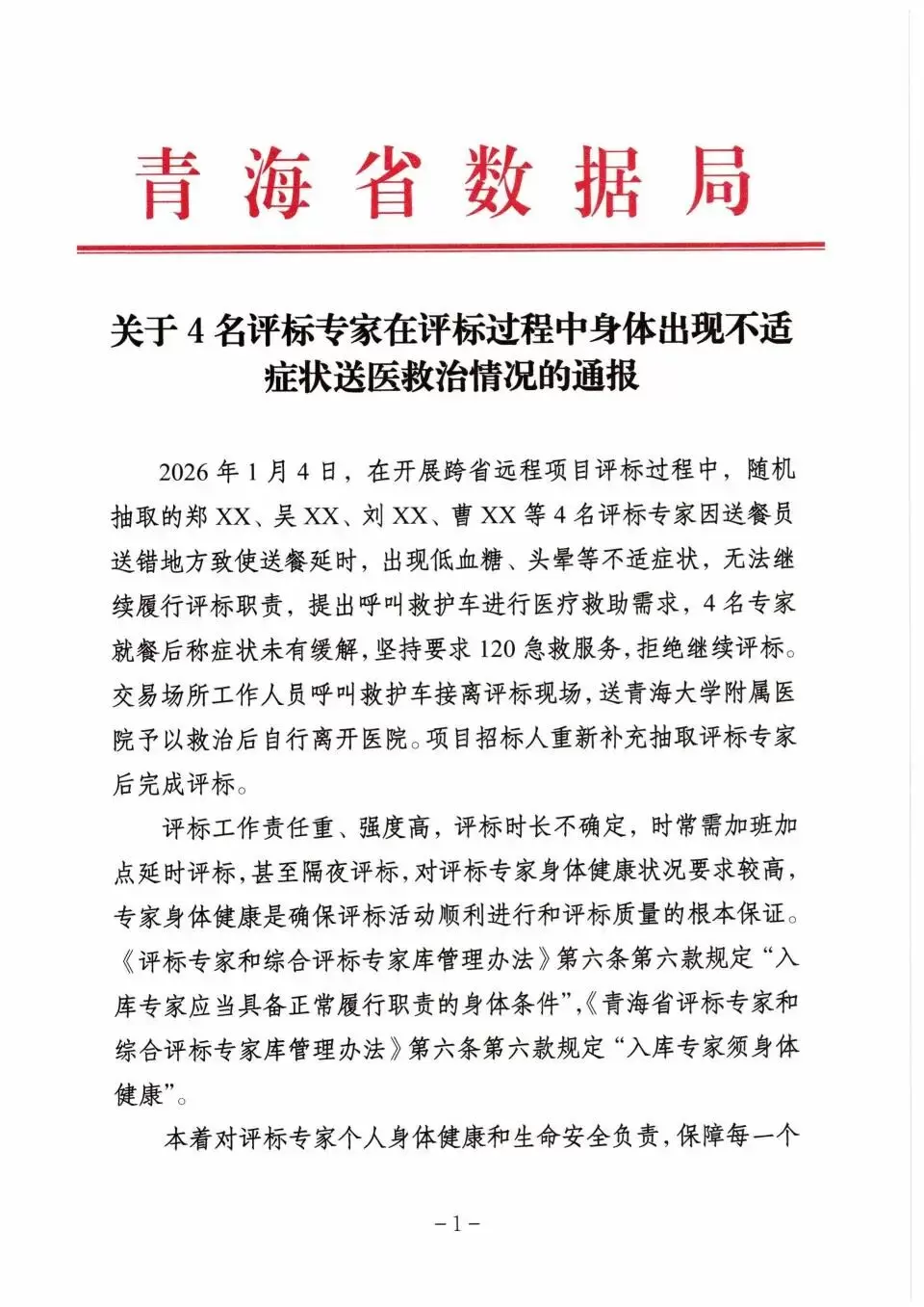 1月7日,青海省数据局在青海省公共资源交易网发布《关于4名评标专家在评标过程中身体出现不适症状送医救治情况的通报》,透露出该省最近发生的一起事件。