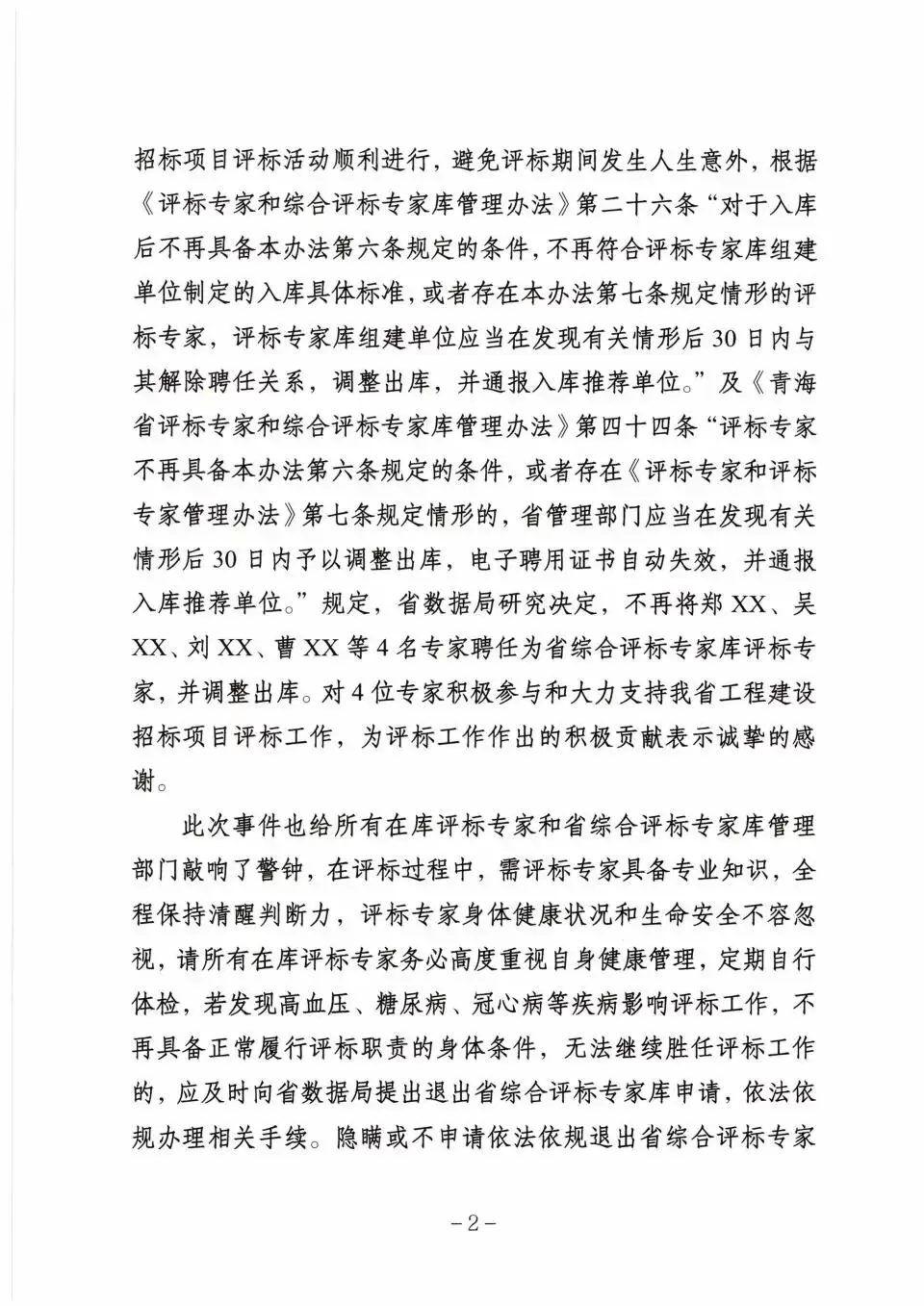 其次,为了“对评标专家个人身体健康和生命安全负责”,青海省数据局研究决定,不再将郑XX、吴XX、刘XX、曹XX等4名专家聘任为省综合评标专家库评标专家,并调整出库。同时“对4名专家的积极贡献表示诚挚的感谢”。
