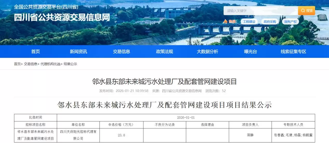1月21日,四川省邻水县还发布了东部未来城污水处理厂及配套管网建设项目结果公示。