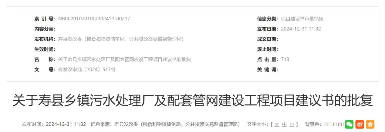 1月初,刚开年,安徽省寿县发改委就发布了“关于寿县乡镇污水处理厂及配套管网建设工程项目建议书的批复”。