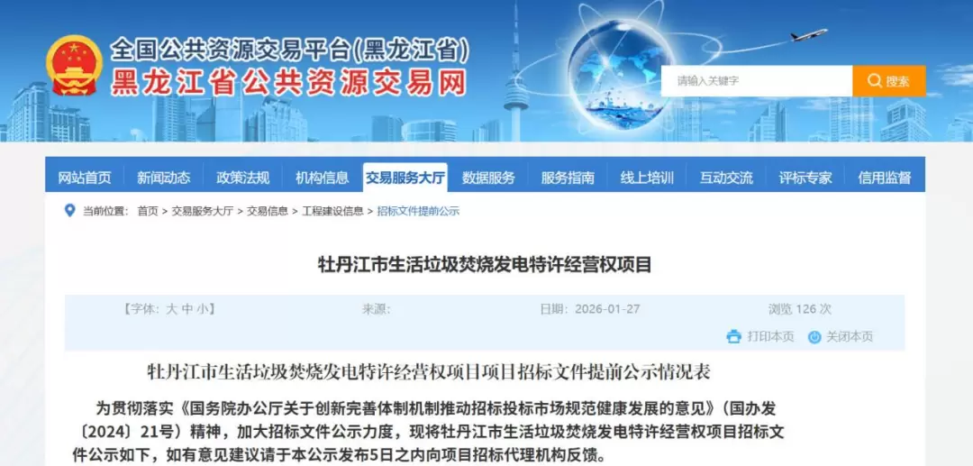 1月27日,黑龙江省公共资源交易平台发布“牡丹江市生活垃圾焚烧发电特许经营权项目项目招标文件提前公示情况表”。内容显示,牡丹江市生活垃圾焚烧发电特许经营权项目已具备招标条件,现对该项目进行公开招标。