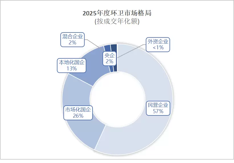 财政支出约束显性化、市场化率见顶、服务价格进入“通缩区间”、行业性“现金流失血”、市场机制承压下的“流标潮”、无人化设备规模化投放、从“民进国退”到“国民共进”的系统性重构、民营企业从“全面竞争”到“生态位生存”、“城市大管家”与“两网融合”定义服务新边界…… 2025年,环卫市场站在了一个从“量增”到“质变”的关键节点,在平静的表面下完成了惊心动魄的动能切换。 2025年是中国环卫市场化进程中的关键转折之年。行业总体规模达到3,405亿元,但同比增长率放缓至5%,标志着市场从高速扩张期进入平稳发展与存量博弈的新阶段。环卫市场化成交年化金额为966亿元,同比仅增长1.2%,增速明显收窄,反映出增量市场空间有限,竞争重心向存量项目优化与服务质量提升转移。 市场竞争格局呈现 “国进民稳、多元共生” 的特征。2025年,民营企业仍占据57%的市场份额(年化总额549亿元),但国有企业实力显著增强,“国企指数”从2021年的18攀升至2025年的41,市场份额提升至41%。市场结构极度分散,全年产生13,925家中标供应商,但头部效应初显,年化额超1亿元的130家企业(0.9%)贡献了32%的市场份额。 技术创新成为核心驱动力。“环卫+无人驾驶” 迎来爆发式增长,2025年相关试点项目年化额激增至74.71亿元,开标无人化环卫设备1,676台,技术对传统成本结构的重构已开始深刻影响项目定价与商业模式。同时,“城市大管家” 等在管项目年化额达119亿元,服务边界不断拓宽,正向“城市运营”演进。 2025年,环卫市场化成交规模首次进入平台期(年化成交额966亿元,同比微增1.2%),标志着以填补空白为核心的“规模扩张时代”终结;与此同时,行业在所有制结构(国企指数攀升至41)、技术路线(无人驾驶设备开标1,676台)、服务内涵(城市大管家在管项目年化额119亿元)三个维度发生系统性重构。 市场规模的平台期,正是价值重构的启动期。旧秩序基于资本与关系的竞争正在落幕,新秩序基于效率、技术与生态的竞争大幕已启。 中国环卫服务行业正从“公共服务外包”向“城市环境数据智能服务”跃迁,其核心矛盾已从“市场化率高低”转为“数据驱动下的运营效率之争”。对于市场参与者而言,构建运营效率、技术应用、服务创新与资源整合的综合能力,将是赢得未来的关键。