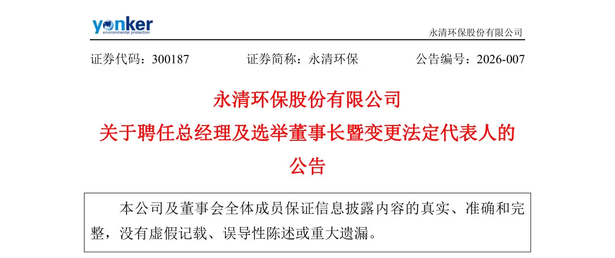 2月2日,永清环保官方微信公众号发布文章《初心如磐 再启新章 刘正军回归任董事长》。其中表示,刘正军的回归标志着公司核心领导力得到强化,在迈向高质量与智能化发展的关键阶段,创始人的掌舵将为永清环保注入战略定力、产业视野与资源协同能力,引领企业迎接未来全新机遇。