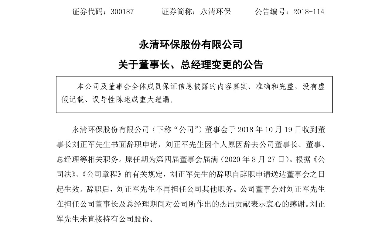 2018年10月22日,永清环保突然发布《关于董事长、总经理变更的公告》。内容显示,公司董事会于2018年10月19日收到董事长刘正军书面辞职申请,因个人原因,刘正军辞去公司董事长、董事、总经理等相关职务,不再担任公司其他职务。