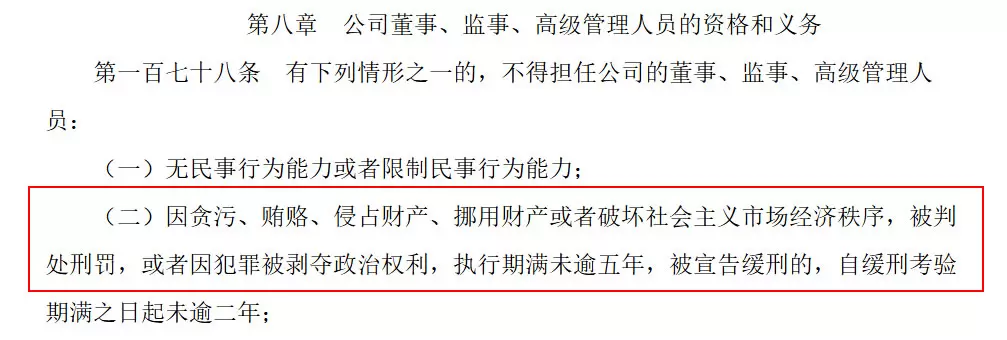 而根据《公司法》第一百七十八条(二)规定,因贿赂被判处刑罚,执行期满未逾五年的,不得担任公司的董事、监事、高级管理人员。