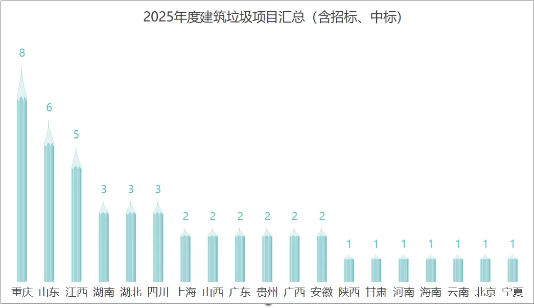2025年,全国共发布47个建筑垃圾资源化利用项目,其中中标项目19个,在招标项目28个。从省份上来说,重庆、山东、江西位列前三(详细项目名单见文末)。