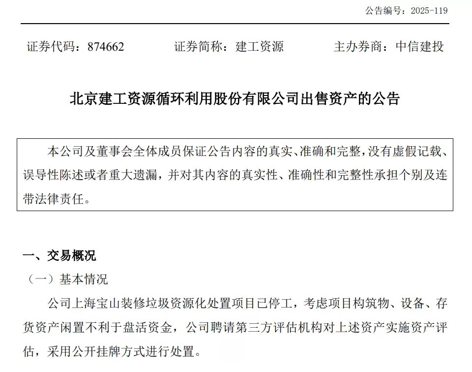 例如,2025年12月5日,建工资源宣布将采用公开挂牌方式出售上海宝山装修垃圾资源化处置项目。