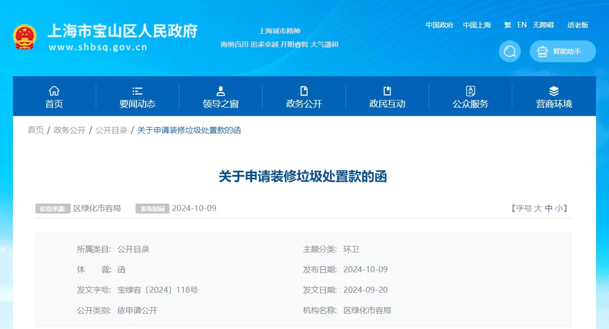 这个《关于申请装修垃圾处置款的函》是宝山区绿化市容局发给区财政局的,其中写到:“由于区财政经费紧张,处置款无法保证按期支付……至2024年9月20日,政府已累计拖欠处置款超过8千万元,使项目运营越发艰难……”