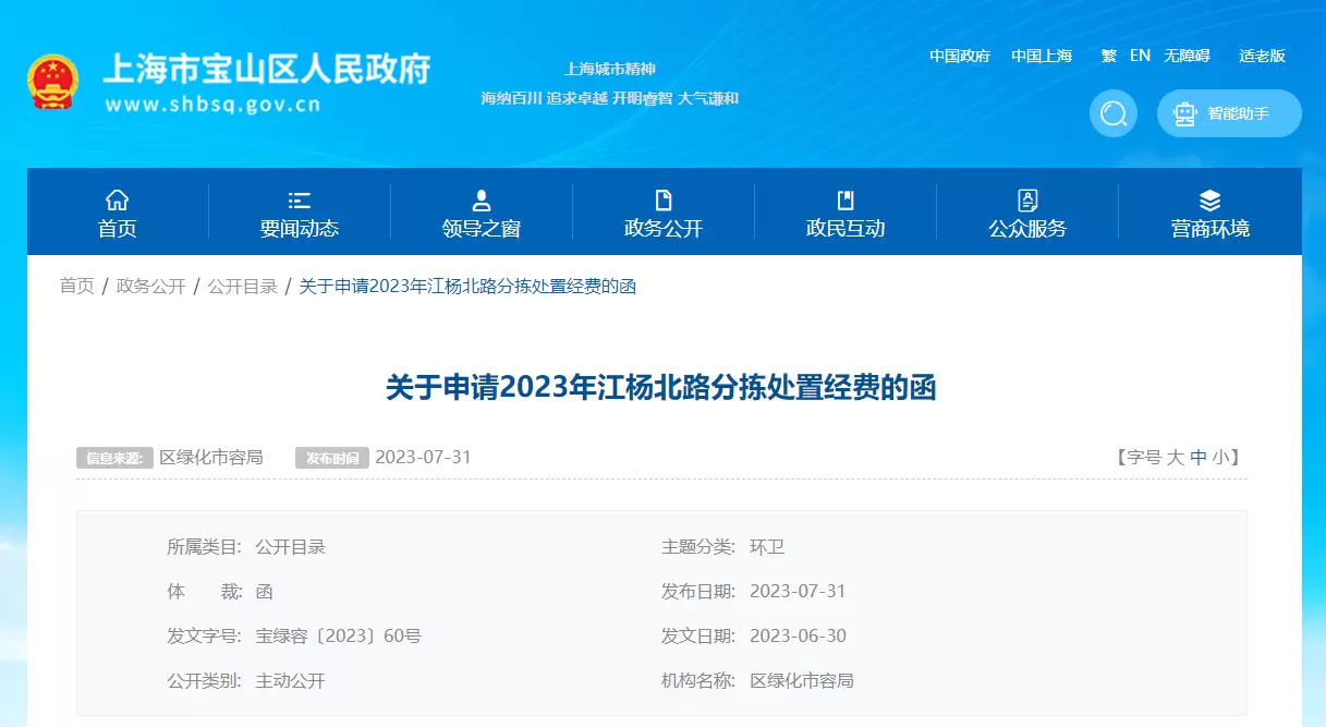 早在2023年,宝山区绿化市容局就发布过《关于申请2023年江杨北路分拣处置经费的函》,其中提到:“为了保障江杨北路处置中心正常运营,确保本区装修垃圾处置及时、有效,特向区财政申请1、2022年10月20日至2022年12月31日实际处置经费1223.9852万元;2、2023年按照计划量30万吨的处置经费4740万元;合计5963.9852万元。”而这里的江杨北路处置中心,就是宝山区装修垃圾资源化利用中心项目所在地。