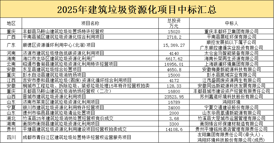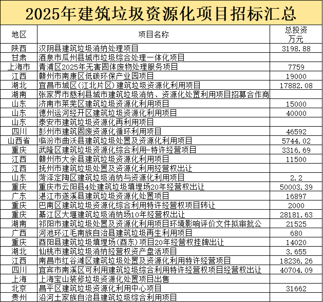 附:2025年建筑垃圾资源化项目招标汇总表