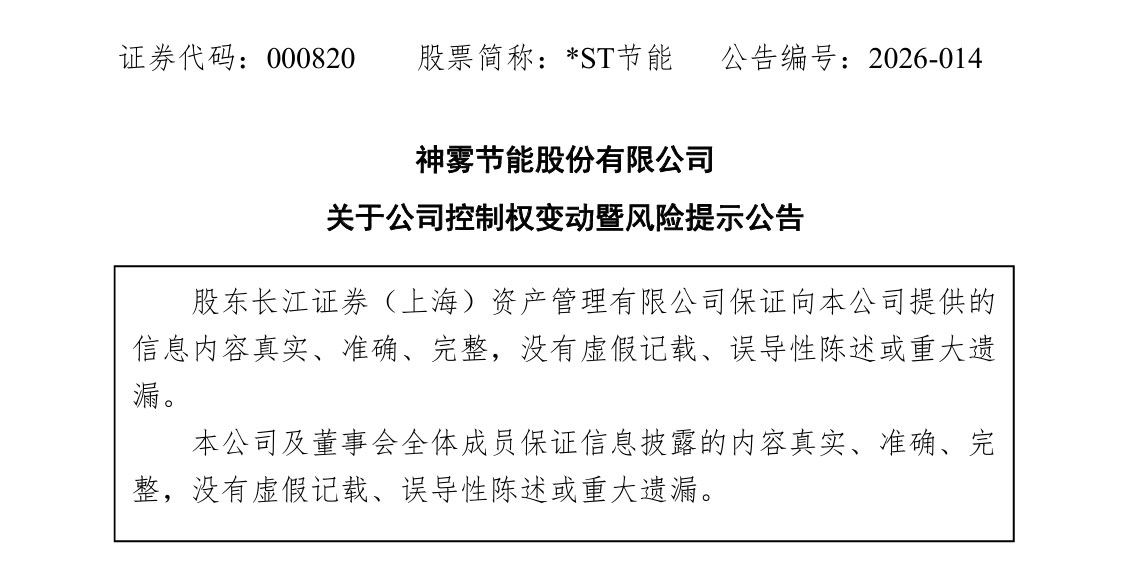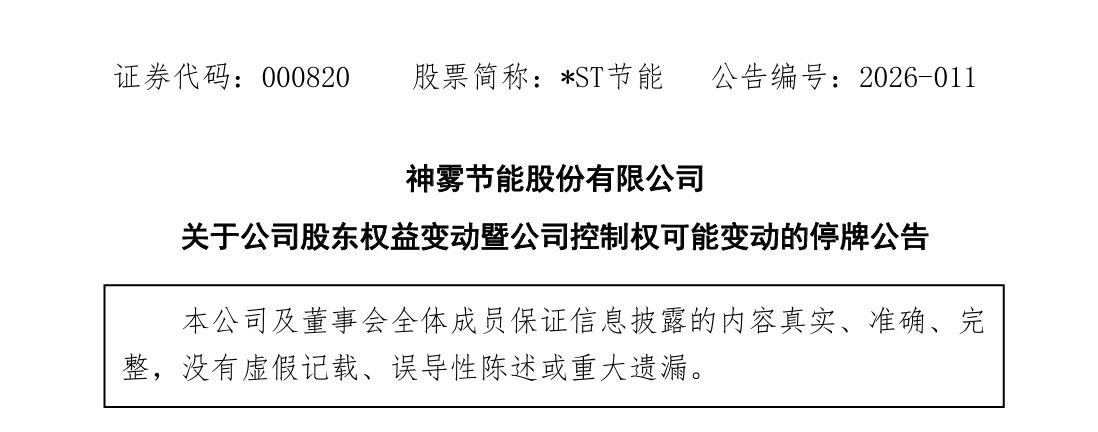 为此,经公司向深圳证券交易所申请,公司股票(股票简称:*ST节能,股票代码:000820)自2026年2月10日(星期二)开市起停牌,预计停牌时间不超过2个交易日。