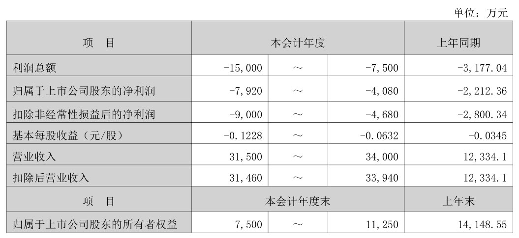 1月30日,公司刚刚公布了2025年的业绩预告。结果显示,公司预计2025年度实现营业收入3.15亿元-3.4亿元,上年同期营业收入为1.23亿元;预计2025年度归母净利润亏损4080万元-7920万元,上年同期则亏损2212.36万元。