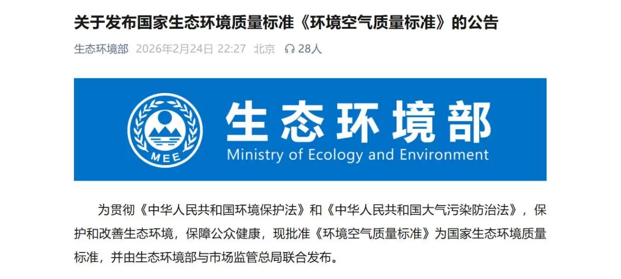到了2月24日,《环境空气质量标准》(GB 3095—2026)终于正式发布,并将自2026年3月1日起实施。