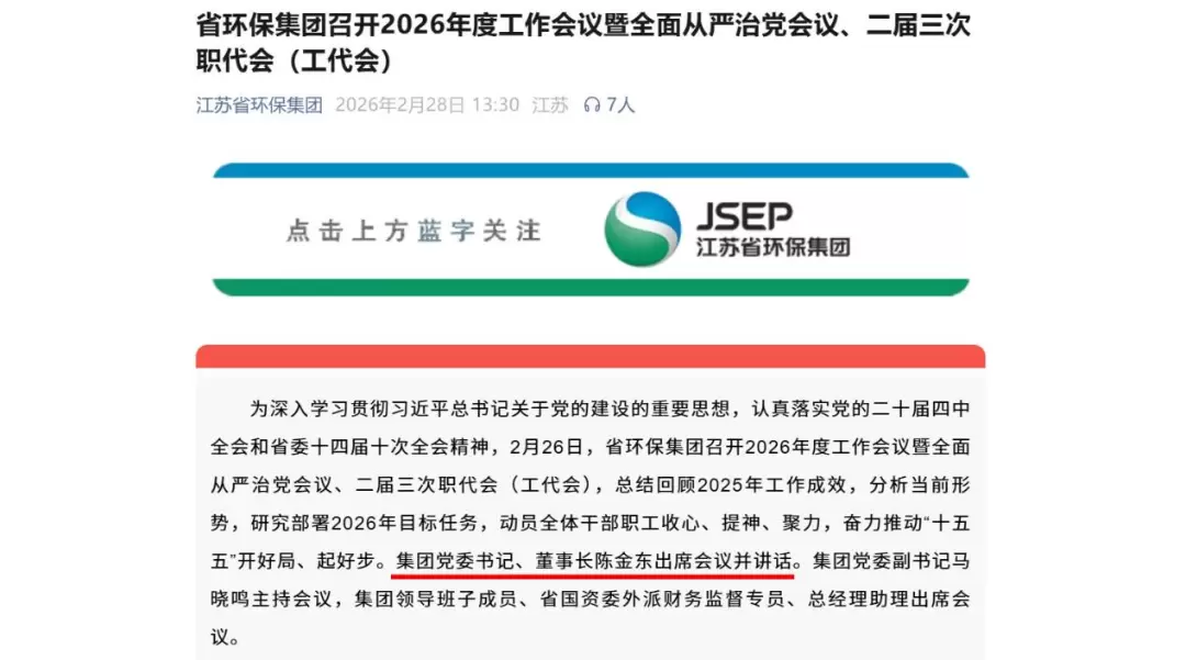 近日,据“江苏省环保集团”消息,2月26日,江苏省环保集团召开2026年度工作会议暨全面从严治党会议、二届三次职代会(工代会),集团党委书记、董事长陈金东出席会议并讲话。