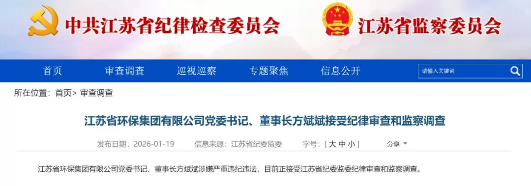此前,1月19日,据江苏省纪委监委消息:时任江苏省环保集团有限公司党委书记、董事长方斌斌涉嫌严重违纪违法,目前正接受江苏省纪委监委纪律审查和监察调查。