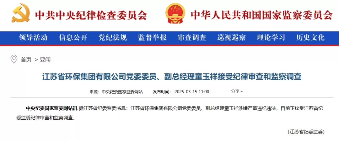 2025年3月15日,江苏省纪委监委传来消息:时任江苏省环保集团有限公司党委委员、副总经理童玉祥涉嫌严重违纪违法,目前正接受江苏省纪委监委纪律审查和监察调查。