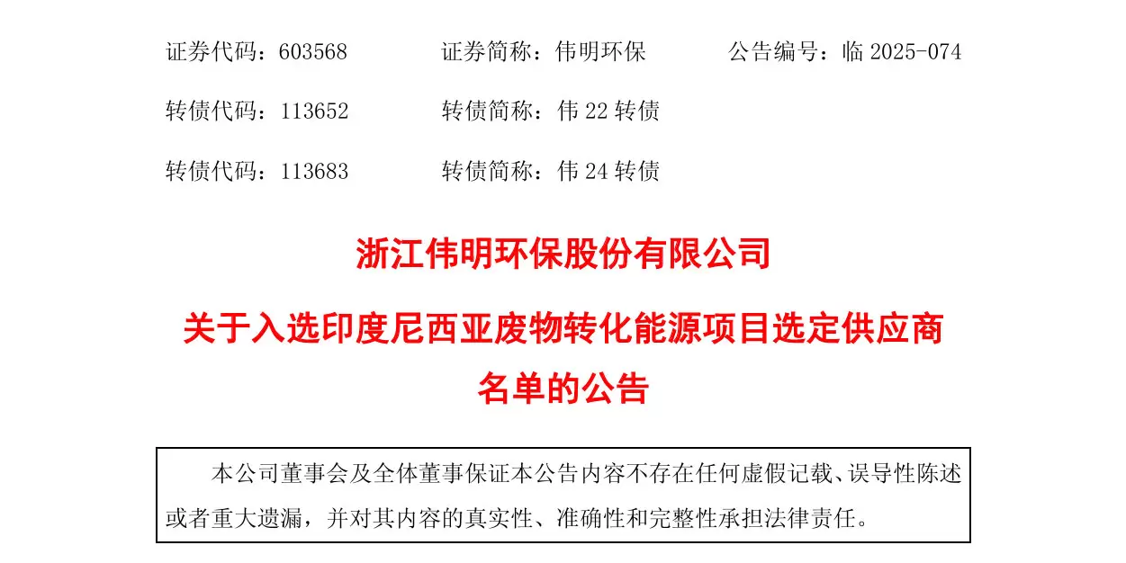 2025年11月2日,伟明环保发布公告称,公司近日收到印度尼西亚主权投资基金发来的通知,确定公司正式入选印度尼西亚环境友好型废物转化能源项目选定供应商名单。