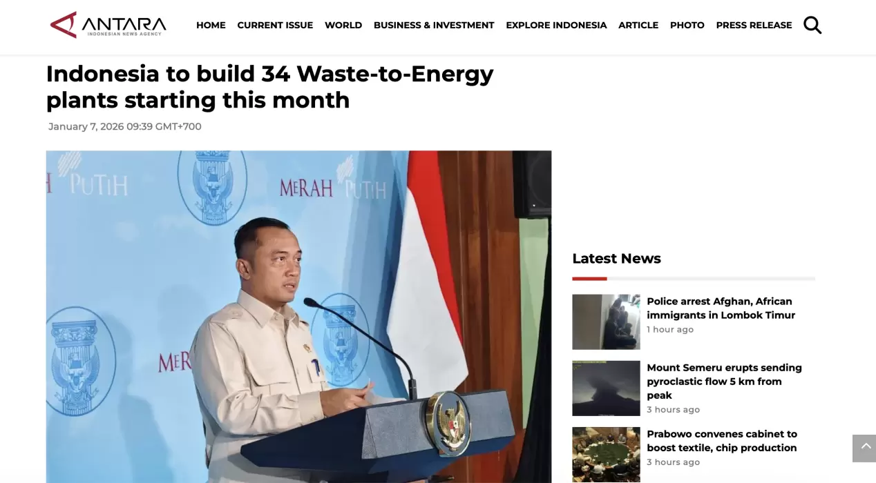 2026年1月,印度尼西亚主权投资基金表示,他们将在2月份宣布首个垃圾发电项目招标结果,该项目将在茂物市和茂物县、勿加泗市和勿加泗县、日惹以及登巴萨等地建设,这些地区是目前准备最充分的地点。
