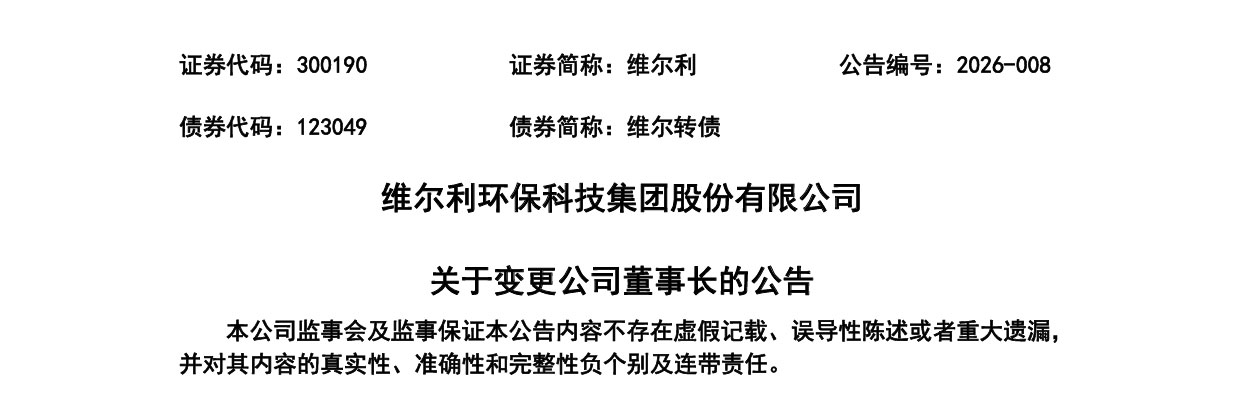 今年2月26日,维尔利发布公告称,公司近日收到董事长李月中递交的书面辞职报告,综合考虑个人情况及公司经营发展与治理架构调整需要,李月中申请辞去公司董事长职务。