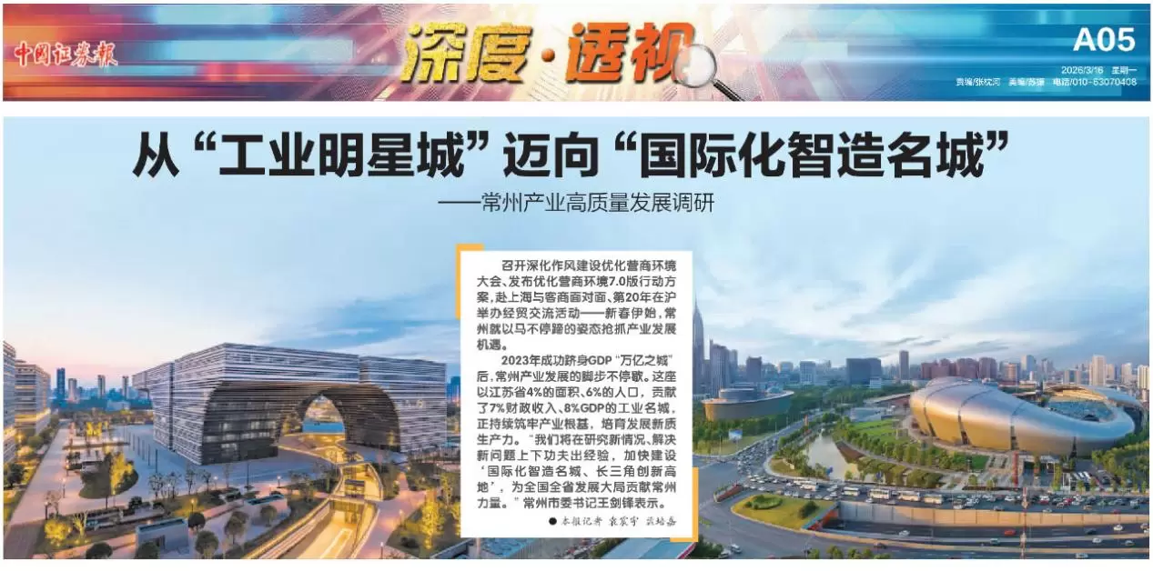 3月16日,《中国证券报》发布了常州产业高质量发展调研,文中充分肯定了常州从“工业明星城”向“国际化智造名城”迈进的“常州模式”。