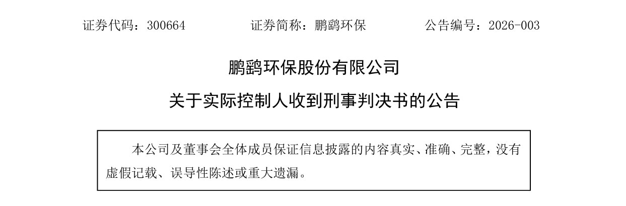 鹏鹞环保在公告中表示,截至公告披露日,王洪春未担任公司的董事或高级管理人员职务。上述判决不影响实际控制人的股东权利行使及公司管理层的依法规范运作,不会对公司的生产经营产生重大不利影响。