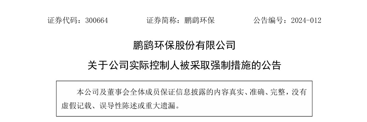 到了3月8日,鹏鹞环保又披露《关于公司实际控制人被变更强制措施取保候审的公告》(公告编号:2024-014),公司收到王洪春先生家属通知,王洪春被变更强制措施取保候审。