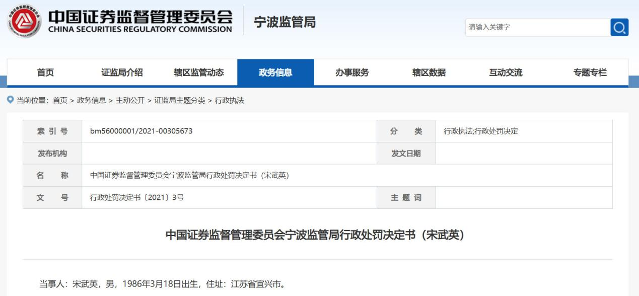 另据“深圳商报-读创”报道,2021年12月2日,宁波证监局曾经发布行政处罚决定书,当事人为宋武英,男,1986年3月18日出生,住址为江苏省宜兴市。