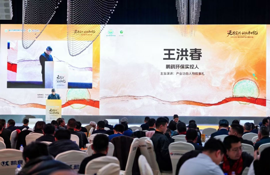 ▼今年3月,在宜兴环保产业50周年大会上,王洪春作为功勋人物受邀发言。图片来源:宜兴市绿色低碳产业协会