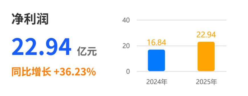 净利润方面的涨幅更大,一跃从2024年的16.84亿元,增加到2025年的22.94亿元,同比大涨了36.23%。